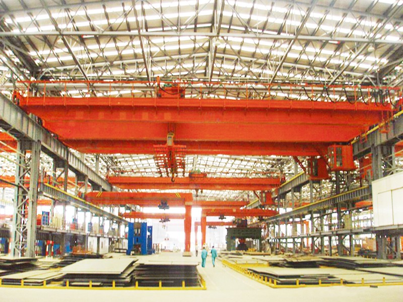 本起重機(jī)采用掛梁吊運(yùn)長(zhǎng)件鋼坯、板材、棒材、盤圓等物品,配置電磁吸盤或夾鉗或特殊群鉤進(jìn)行吊裝,主要由箱形橋架、起重小車、大車運(yùn)行機(jī)構(gòu)、司機(jī)室和電氣控制系統(tǒng)組成,配有停電保磁系統(tǒng)。起升機(jī)構(gòu)多采用單電機(jī)、雙減速器、雙卷筒布置,呈雙吊點(diǎn)形式。掛梁布置形式分垂直于主梁或平行于主梁兩種。其余形式與QD型起重機(jī)相同。