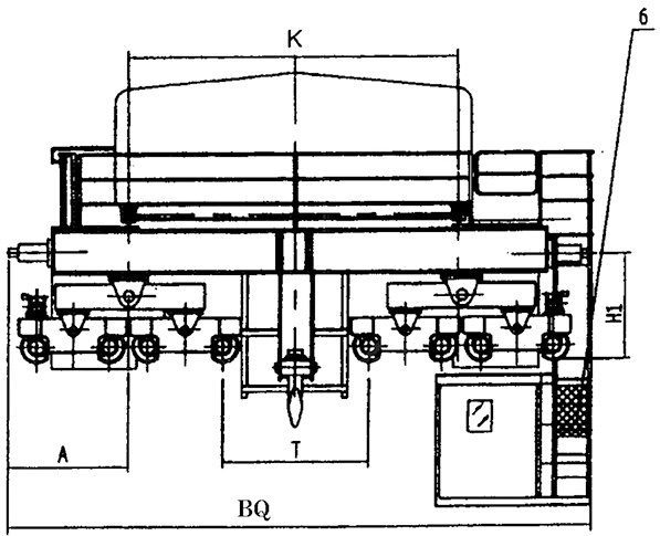 1、電氣 2、小車 3、大車 4、橋架 5、大車導(dǎo)電架 6、司機(jī)室保護(hù)網(wǎng)