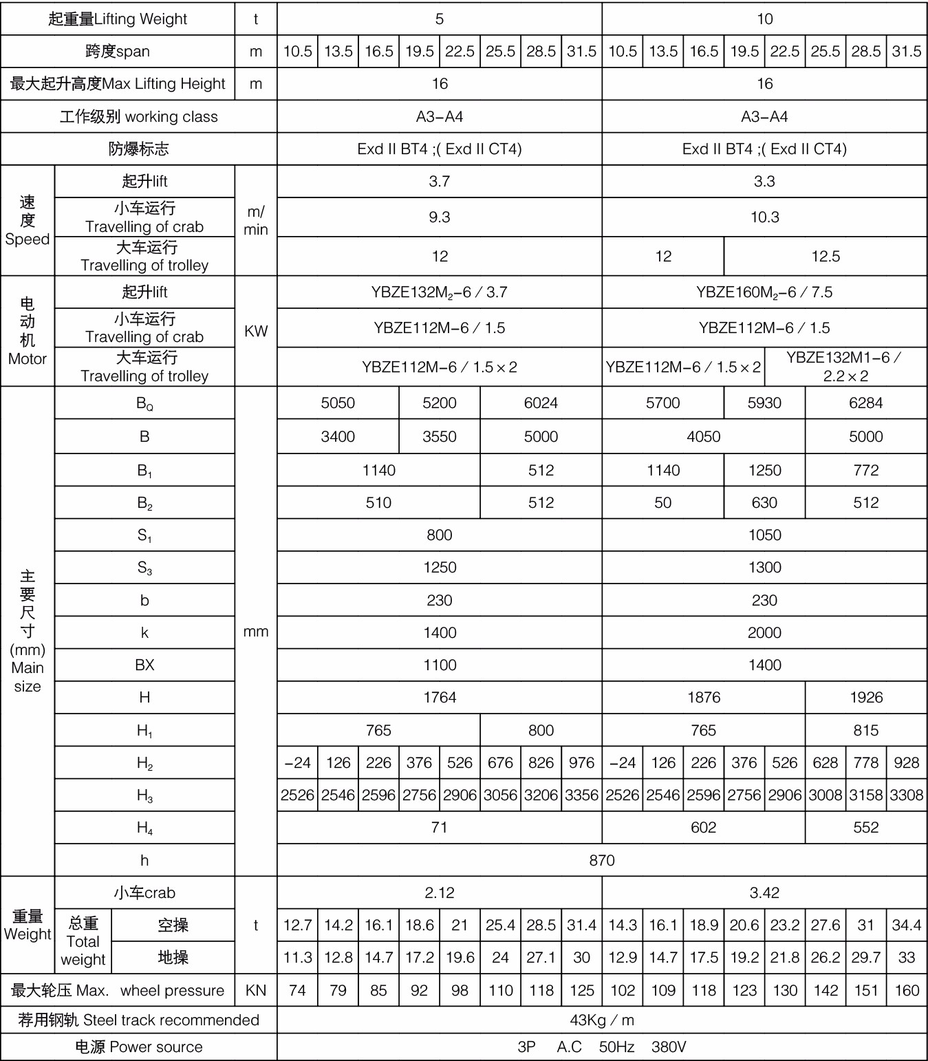 QB型防爆橋式起重機所有電機、電器防爆性能符合GB3836.2-2000《爆炸性氣體環(huán)境用電氣設備第2部分:隔爆型“d”》、整機性能符合JB/T5897-2006《防爆橋式起重機》標準之規(guī)定,經(jīng)國家指定的防爆產(chǎn)品檢驗單位檢驗合格,取得了《防爆合格證》。防爆標志分別為ExdII BT4、Exd II CT4。