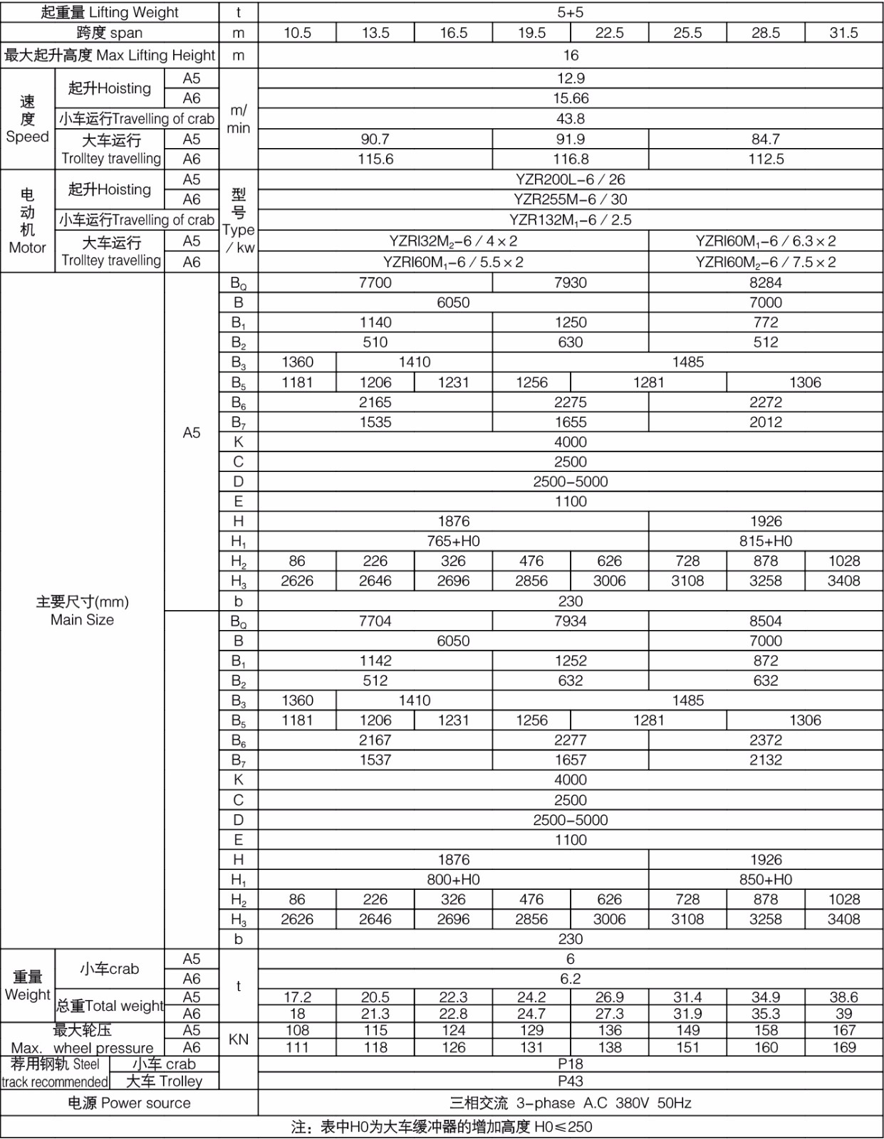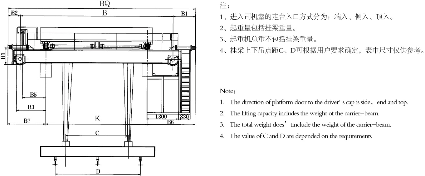 本起重機采用掛梁吊運長件鋼坯、板材、棒材、盤圓等物品,配置電磁吸盤或夾鉗或特殊群鉤進行吊裝,主要由箱形橋架、起重小車、大車運行機構(gòu)、司機室和電氣控制系統(tǒng)組成,配有停電保磁系統(tǒng)。起升機構(gòu)多采用單電機、雙減速器、雙卷筒布置,呈雙吊點形式。掛梁布置形式分垂直于主梁或平行于主梁兩種。其余形式與QD型起重機相同。